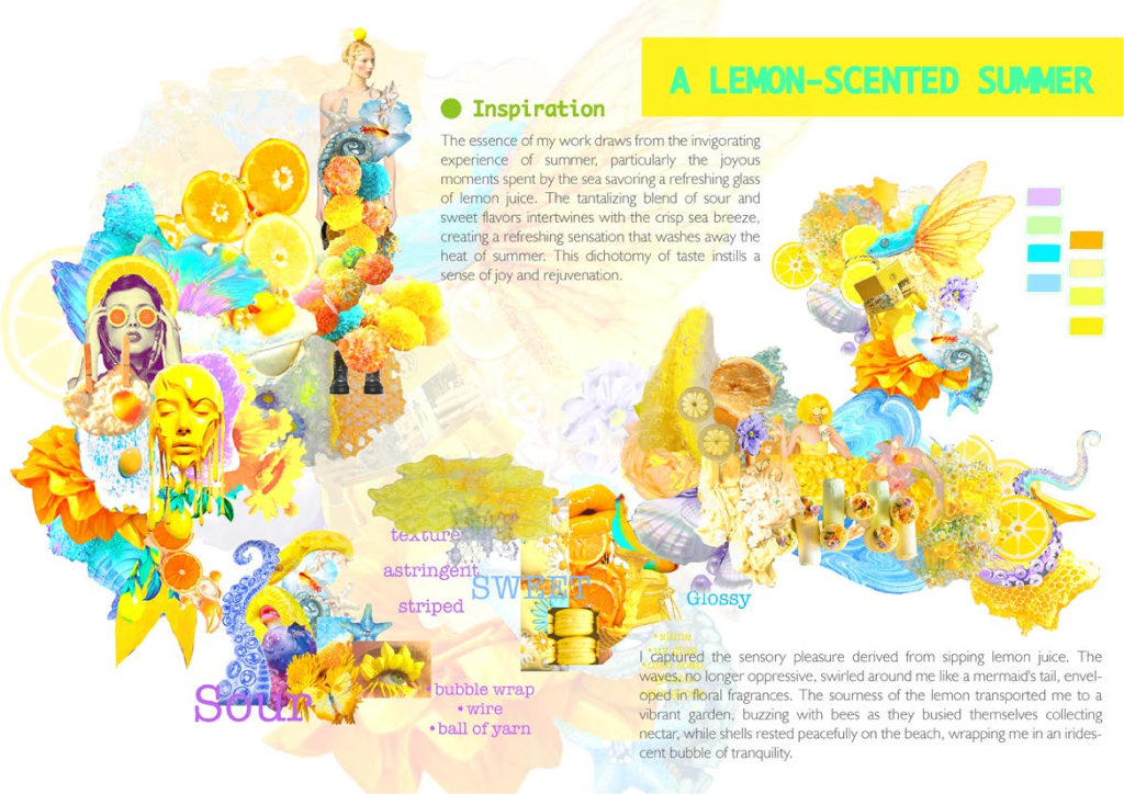 The essence of my work draws from the invigorating experience    of    summer,particularly    the    joyous moments spent by the sea savoring a refreshing glass of  lemon  juice.The   tantalizing   blend  of  sour  and sweet flavors  intertwines with  the  crisp sea  breeze, creating a refreshing sensation that washes away the heat  of  summer.This   dichotomy  of  taste   instills  a sense of joy and  rejuvenation.